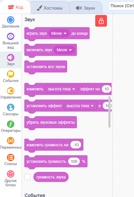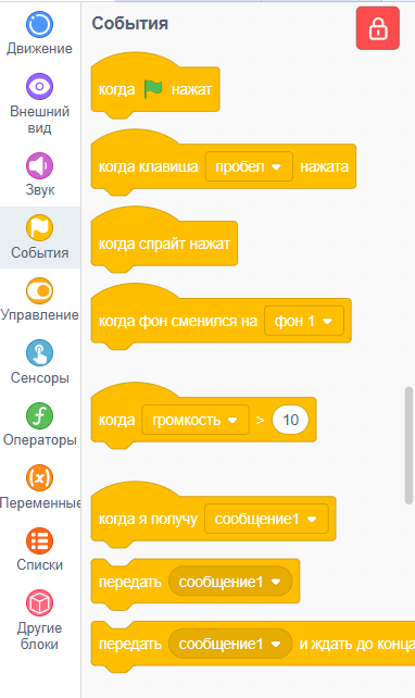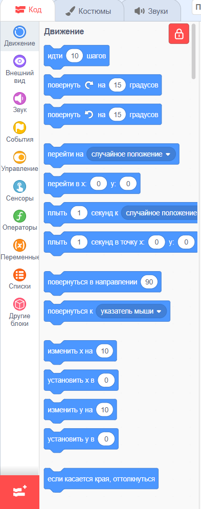 Слева (Цветные кружочки): Это палитры команд. Синие — движение, сиреневые — внешний вид, желтые — события.